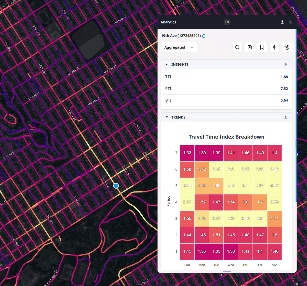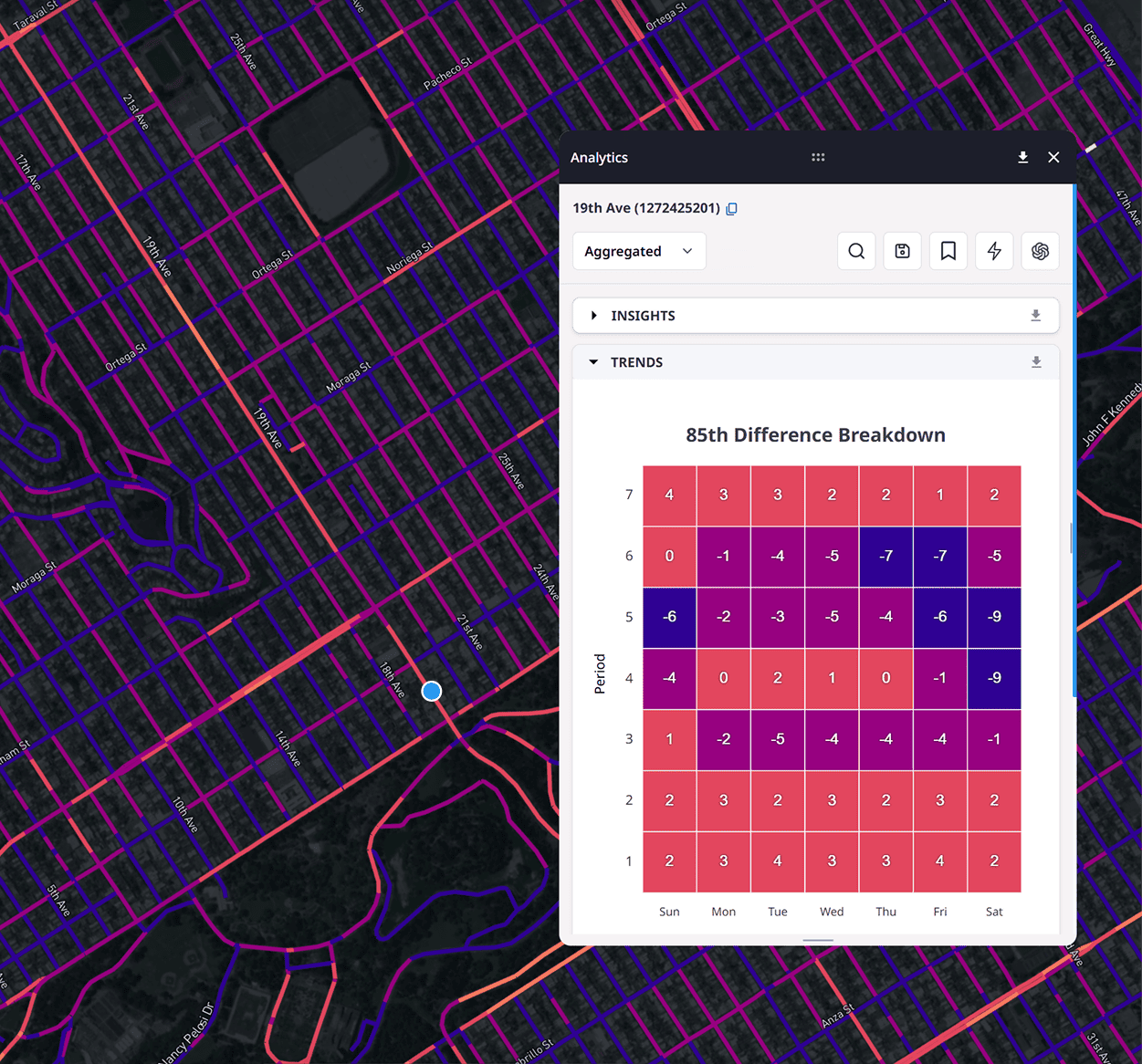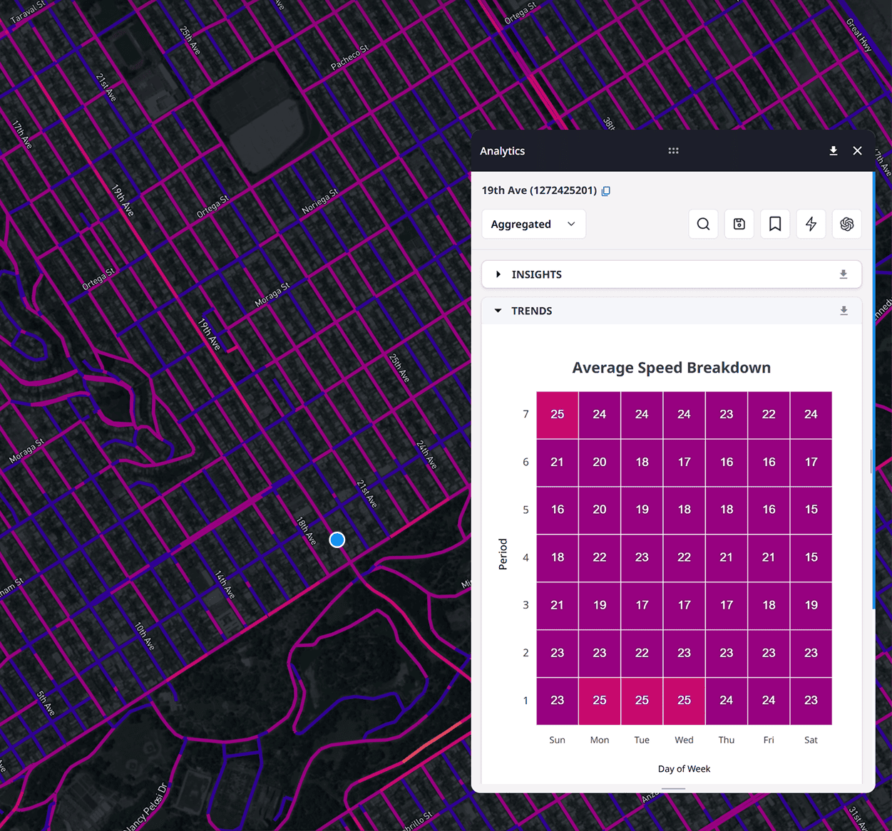 Gain access to traffic speed from connected vehicles on all your local roads. Insights reports allow users to gauge roadways with average, percentile speeds, and filter by time period or date ranges.